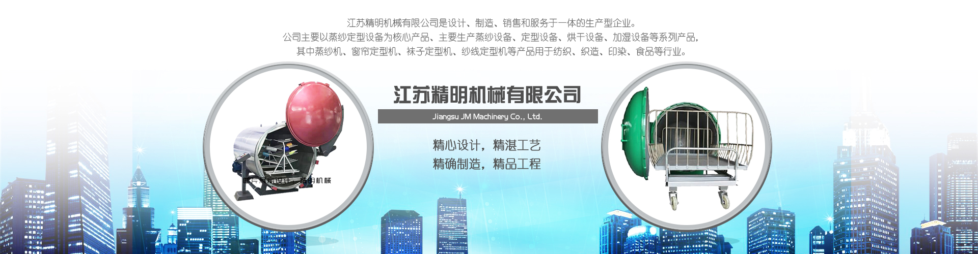 江蘇精明機械有限公司是設計、制造、銷售和服務于一體的型企業。公司主要以蒸紗定型設備為核心產品、主要蒸紗設備、定型設備、烘干設備、加濕設備等系列產品,其中蒸紗機、窗簾定型機、襪子定型機、紗線定型機等產品用于紡織、織造、印染、食品等行業。主要經營包括:1、蒸紗設備:蒸紗機、蒸紗箱、蒸紗缸、蒸紗鍋、蒸紗小樣機等2、定型設備:窗簾定型機、襪子定型機、圍巾定型機、手套定型機、紗線定型機、低彈絲定型機、丙綸絲定型機等3、烘干設備:布料烘干機、拉幅烘干機、染整烘干機等4、加濕設備:棉紗加濕機、氣流紡筒紗加濕...